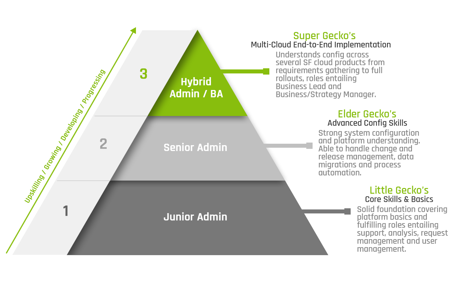 The core team at Cloud Gecko (including our wider networks), possess vast industry experience across a large number of sectors having worked for and within both B2B and B2C corporate and SME organisations. Our knowledge and skills have been fostered from within actual companies, working on multiple programmes, projects and sprints delivering end-to-end implementations and digital transformations globally. True all-round knowledge that makes Salesforce knowledge click comes from real-life experience and we want to share that knowledge with you as you're trained, which gives us and you the edge over other candidates.